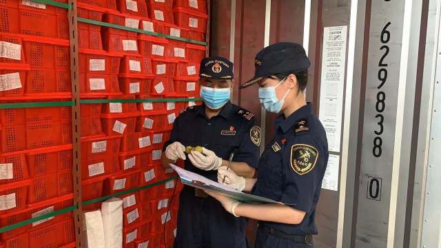 黄埔海关所属增城海关关员对出口荔枝开展现场监管。