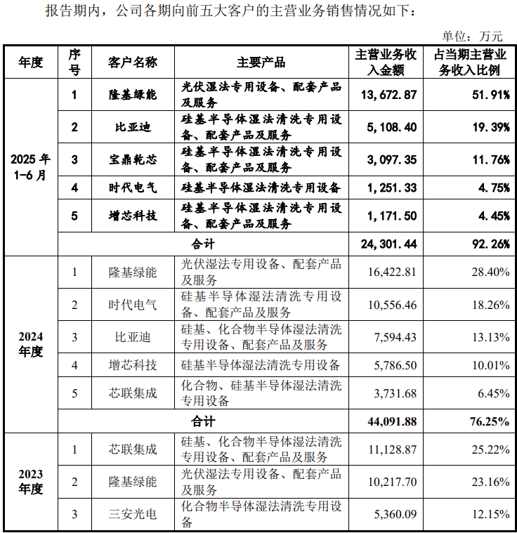 2025年1-6月,公司向隆基绿能销售光伏湿法专用设备、配套产品及服务金额为13,672.87万元,占主营业务收入比例为51.91%,存在单一客户收入占比超过50%的情形,主要系公司光伏湿法设备客户收入集中,为满足隆基绿能先进BC工艺产线(HPBC2.0产线)建设及快速投产需求,公司当期实现BC工艺光伏湿法设备收入金额较前期快速增长。