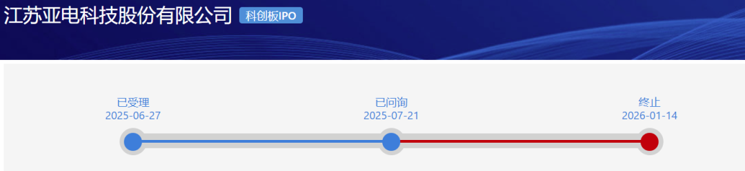 1月14日,上交所公布关于终止对江苏亚电科技股份有限公司科创板IPO的决定,直接原因是公司及保荐机构华泰联合证券撤回申报。亚电科技成为2026年科创板IPO首家终止审核的公司。公司申报科创板IPO于2025年6月27日获得受理,次月21日收到首轮问询,但未见公布问询回复。公司本次IPO拟募资9.50亿元。
