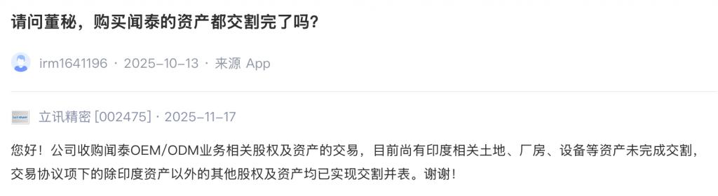 去年 11 月,立讯精密在回应投资者提问时表示,目前目前尚有印度相关土地、厂房、设备等资产未完成交割,交易协议项下的除印度资产以外的其他股权及资产均已实现交割并表。