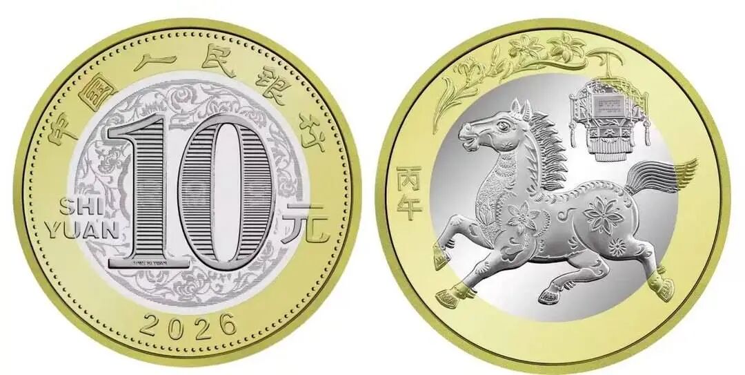 据悉,本次发行的2026年贺岁纪念币面额10元,材质为双色铜合金材质,发行数量1亿枚,正面为面额和年份,背面以剪纸风格马形象为主,辅以花灯和萱草图案,壁面左侧刊“丙午”字样。