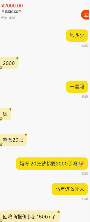 在二手交易平台上,马年贺岁纪念币、纪念钞的价格已翻数倍。一套20枚纪念币和20枚纪念钞的价格有卖家开价1100元至1499元不等。对于备受关注的马年纪念钞,不同商家的报价差距较大,一套20张、面额为20元的马年纪念钞也有卖家开价2000元。该卖家称,整套20张纪念钞的回收商报价已超过1500元,自己也是随行就市。