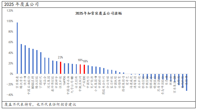 覆盖公司平均收益率为22.95%,跑赢所有与国内公司相关的主流指数。2025年则出现了均值回归现象,覆盖公司总体表现弱于主流指数。