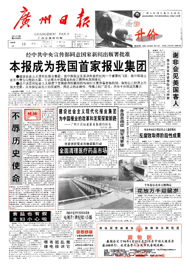 1996年1月15日,广州日报成为我国首家报业集团,次日的《广州日报》头版报道了消息并配发社论。