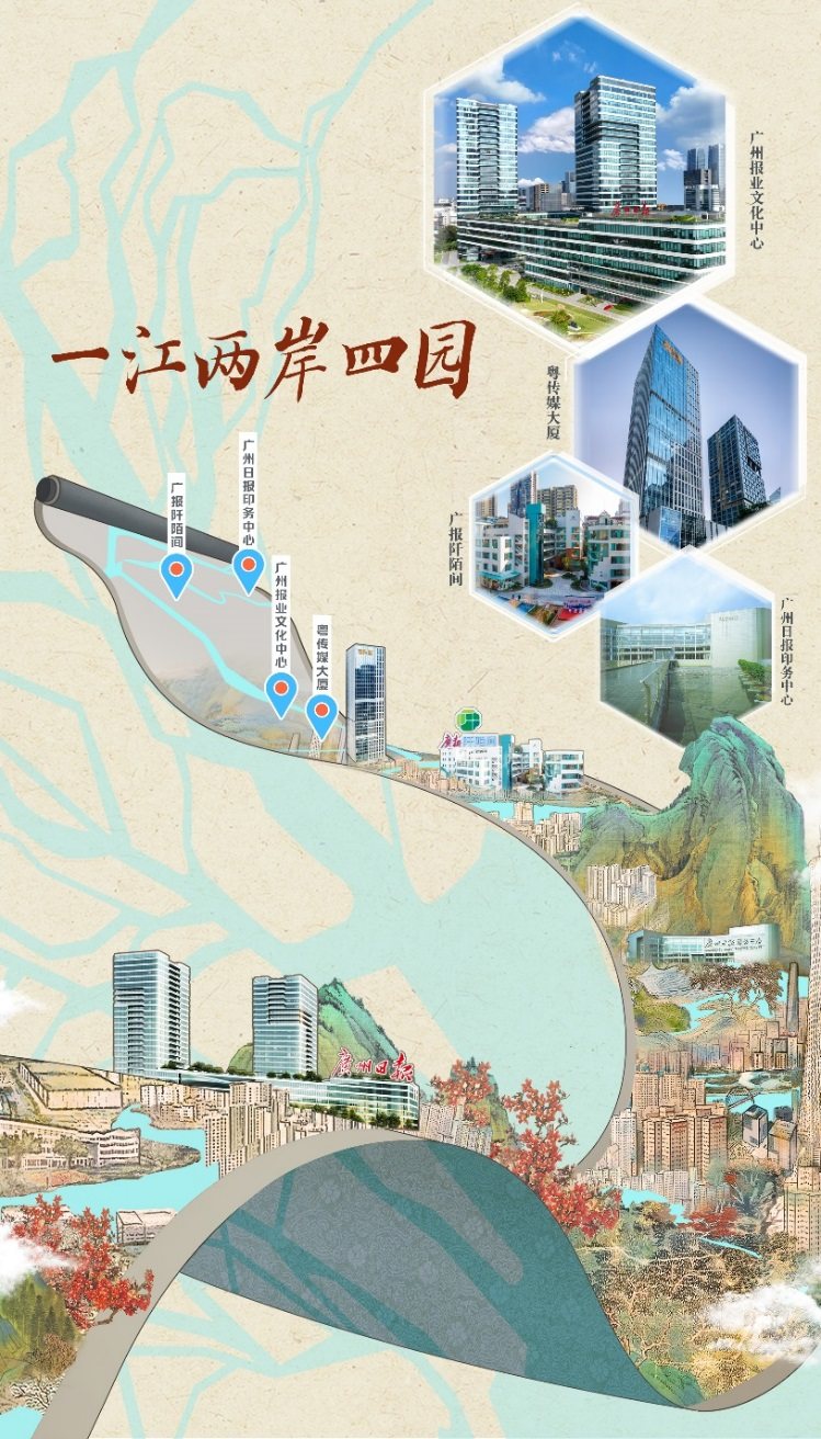 广州报业文化中心、粤传媒大厦、广报“阡陌间”和广州日报印务中心这“一江两岸四园”,如雄鹰之翼,托举着“广州日报报业集团”这块招牌,在时代浪潮中逐光前行。