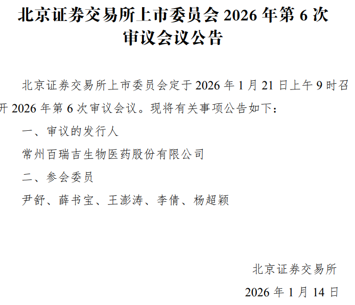 北交所官网1月14日信息显示,北交所上市委员会定于2026年1月21日9时召开2026年第6次审议会议,审议常州百瑞吉生物医药股份有限公司(以下简称百瑞吉)的IPO申请。