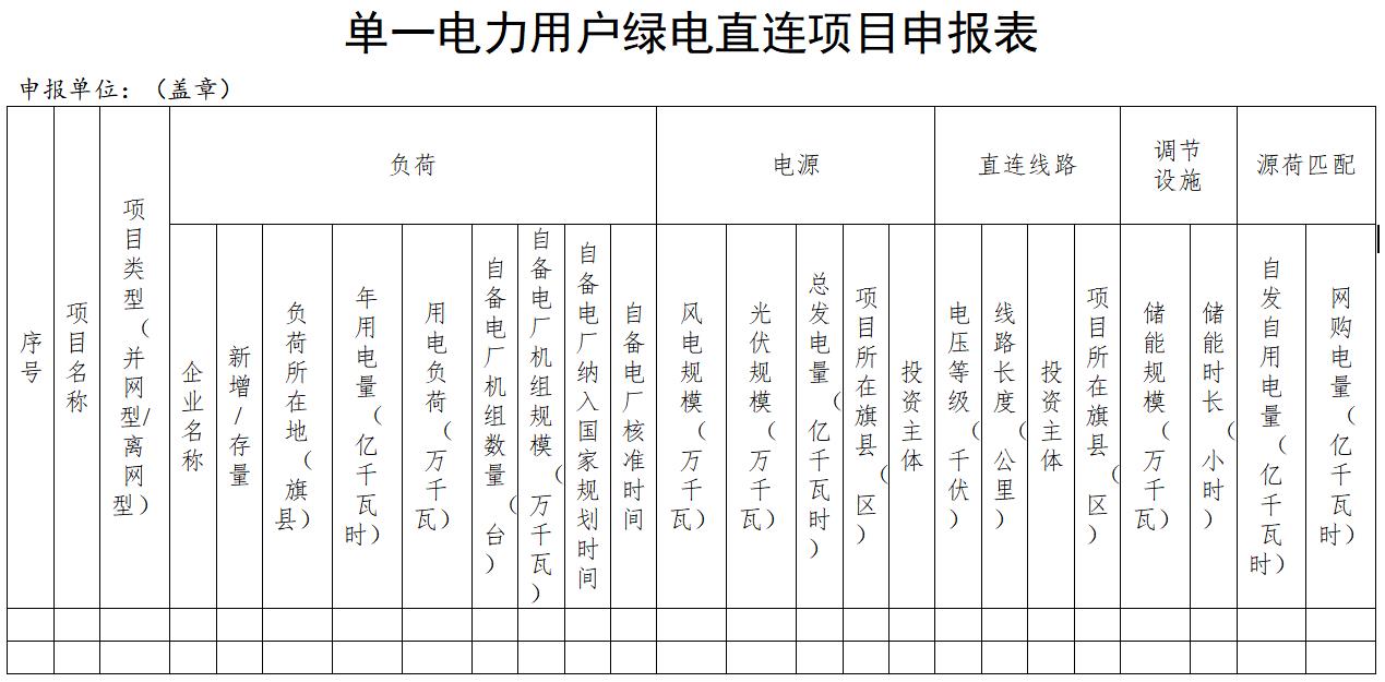 内蒙古自治区单一电力用户绿电直连项目申报大纲