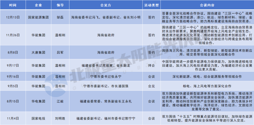 福建省则积极推进核电、海上风电与海洋经济的高质量发展,华能集团多次进行拜会与会谈,重点聚焦核电及海上风电等领域的合作;华电集团与国家电投则围绕“十五五”期间的重点能源项目规划展开深入交流,共同加快绿色能源低碳转型步伐,提升能源安全保障能力。