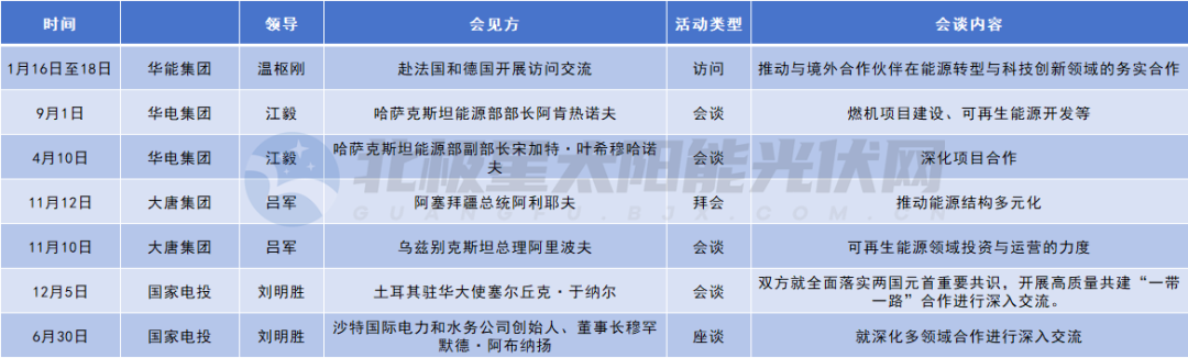 除国内市场之外,“一带一路”沿线国家及法国、德国等欧洲市场也是五大发电集团拓展的重点。华电集团董事长分别与哈萨克斯坦能源部部长、副部长会谈,推进燃机项目建设与可再生能源开发;国家电投则聚焦与土耳其共建“一带一路”能源合作;大唐集团希望与阿塞拜疆、乌兹别克斯坦深化能源领域多元化合作,加大可再生能源投资运营力度;华能集团董事长温枢刚则赴法国、德国访问,推动能源转型与科技创新领域的务实合作。