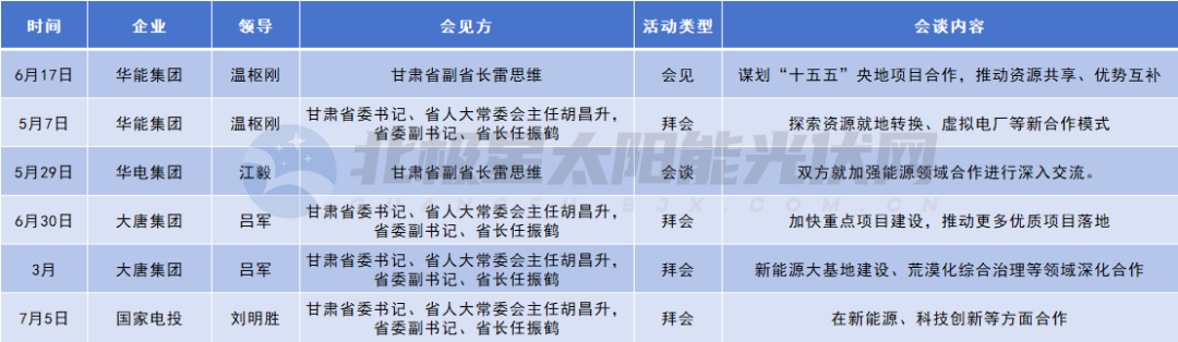 另一“沙戈荒”重镇甘肃,同样跻身热点第一梯队。华能集团、大唐集团、华电集团、国家电投“一把手”密集对接当地政府。其中,华能集团不仅聚焦资源就地转换、虚拟电厂等新合作模式之外,还就推进甘肃沙戈荒外送基地等重点项目在“十五五”开发建设及资源共享等方面进行深入交流。大唐、华电、国家电投则就新能源大基地建设、荒漠化综合治理等领域深化合作进行交流。