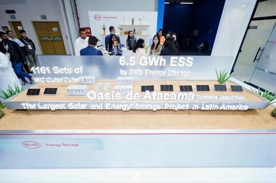 展会现场,比亚迪储能以沙盘形式直观展示了位于智利阿塔卡马沙漠极端干旱环境中已成功并网的大型光储项目案例。