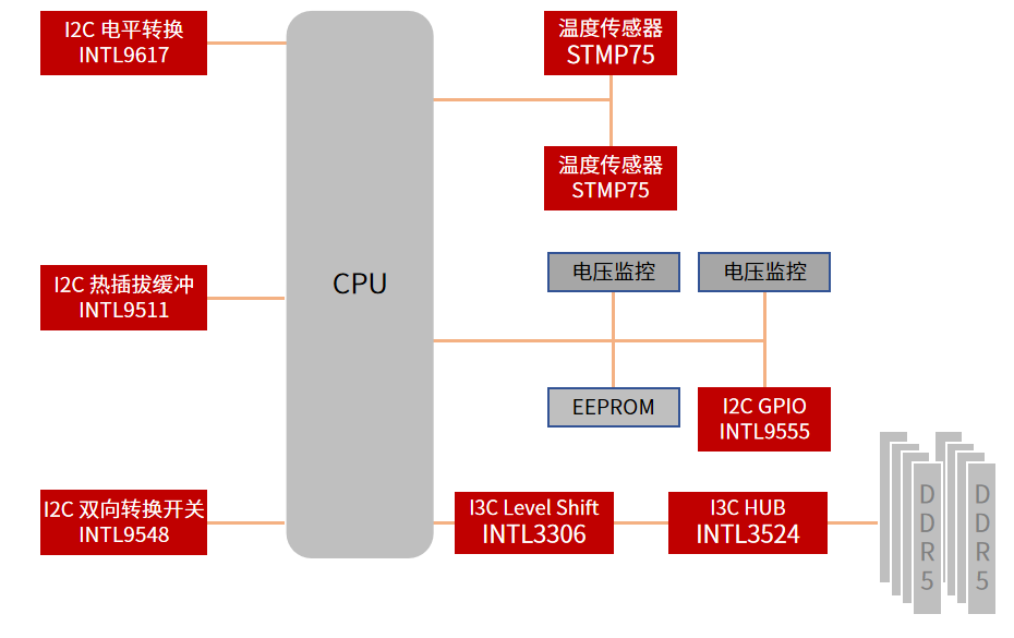 I2C/I3C接口扩展与管理:支持多电压域通信、接口复用、GPIO扩展及DDR5相关管理;