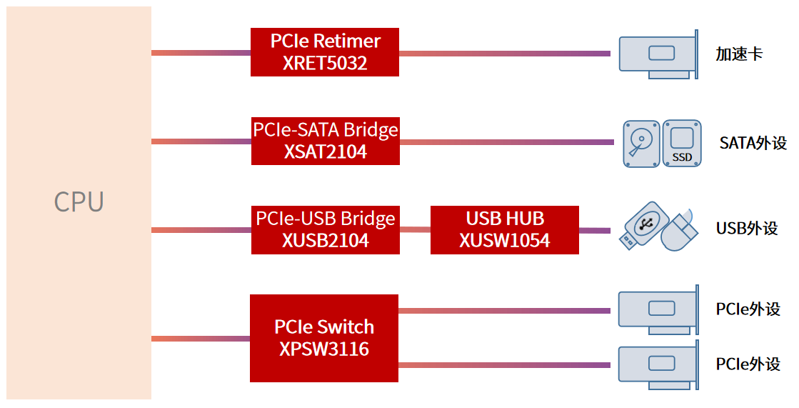 针对PC平台中GPU、加速卡、存储及高速外设的扩展需求,互联方案通常围绕PCIe架构展开,包括: