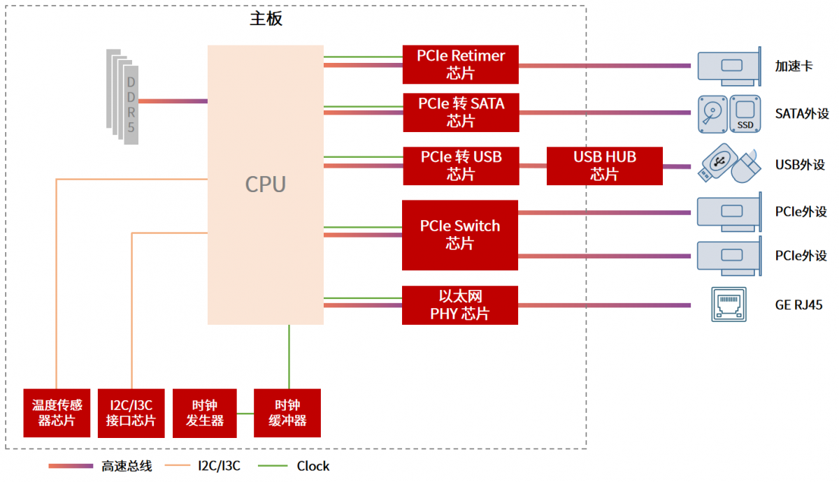 PCIe Retimer:用于补偿PCIe5.0等高速链路中的插损与抖动,保障长距离或复杂布线下的信号完整性;