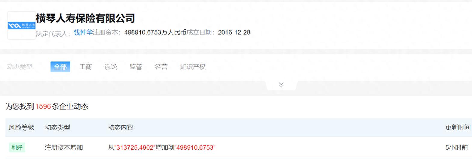 瑞财经王敏 1月14日,天眼查显示,横琴人寿保险有限公司(以下简称“横琴人寿”)发生工商变更,注册资本由约31.37亿元增至约49.89亿元,增幅59%。