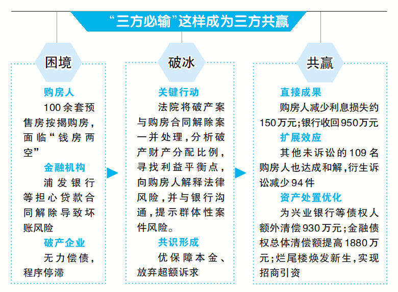 去年8月,在苏家屯区法院的主持下,14名购房人与浦发银行达成调解协议。不仅为购房人减少利息损失约150万元,更向浦发银行、建设银行合计支付950万元,提升金融机构债权清偿额,化解坏账风险。“拿到钱的那一刻,悬了4年的心终于放下了!”购房人王先生激动不已,他不仅拿回了扣除银行本金后的剩余购房款,更避免了被银行起诉的诉累,节省了利息。浦发银行负责人坦言:“法院的调解让我们在破产财产有限的情况下,最大限度收回本金,降低了金融坏账风险。”