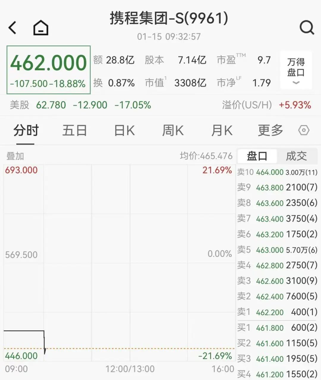 1月15日,携程港股开盘重挫,一度跌超20%,截至发稿,跌18.88%,报收462港元。美股携程则在14日收盘跌超17%,报62.78美元。