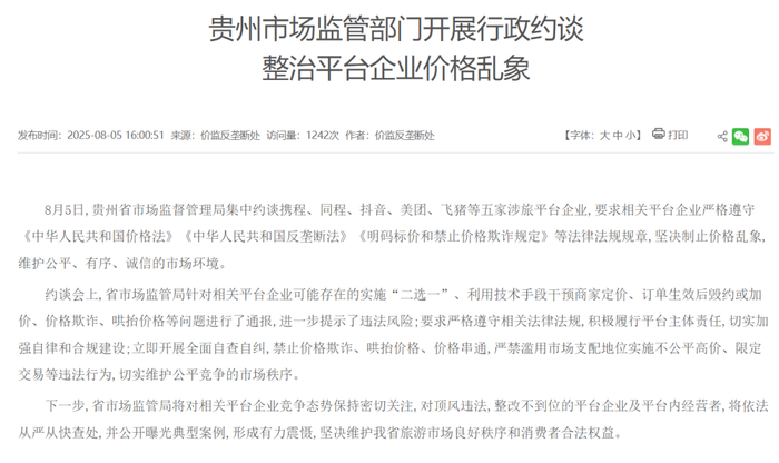 譬如2025年郑州市市场监管局和郑州市市场监管局均曾约谈过携程平台。