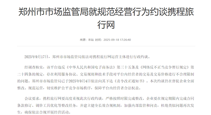 尤其是郑州市市场监管局,单独对携程旅行网运营主体进行行政约谈。