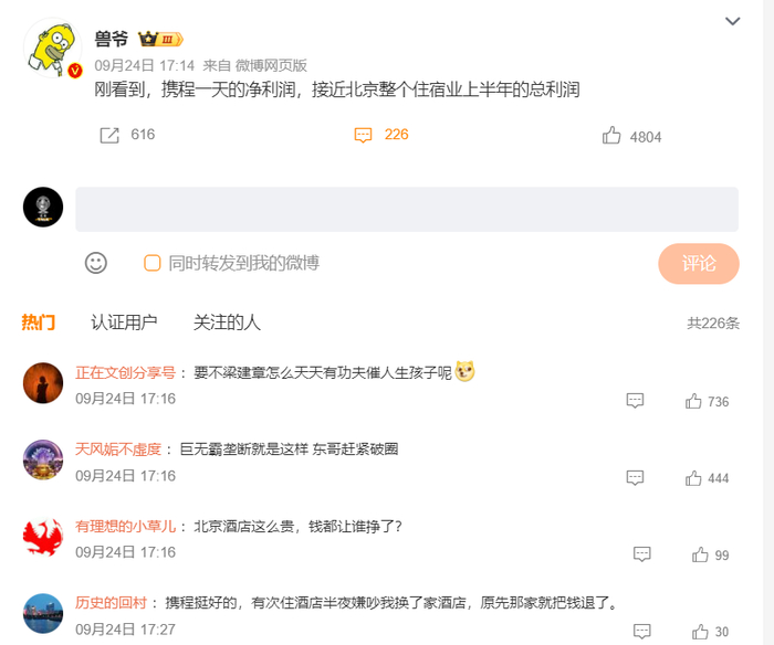 如今携程的市值已经超过了3000亿元,超过了京东和百度等企业,利润率更是惊人,不输部分游戏公司。