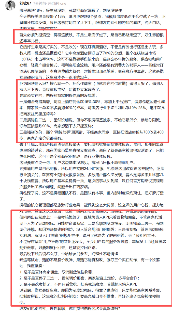 他表示携程把合作商家(也就是它的供应链)薅得太狠了,薅到人家活不下去,携程对商家的操作真的没底线: