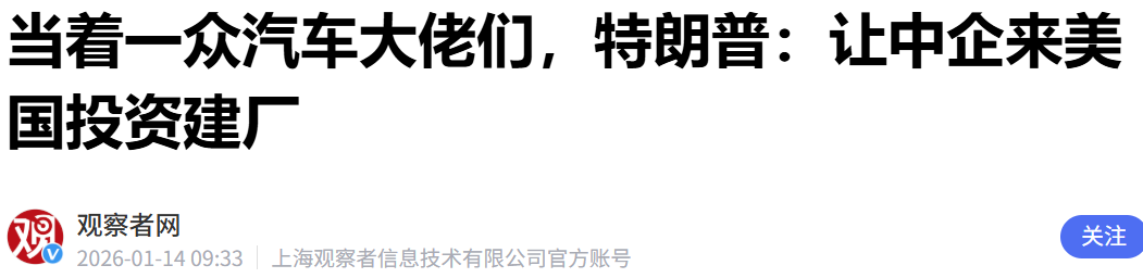电动知家消息,2026年1月13日,美国总统特朗普在密歇根州底特律发表演讲时,公开邀请中国汽车制造商赴美建厂。这一表态与他长期以来对中国汽车施加高额关税的强硬立场形成鲜明对比。“如果他们想来这里建厂,雇佣你们、你们的朋友和邻居,那太好了,我很欢迎。让中国来,让日本来。”特朗普面对台下包括福特汽车首席执行官吉姆·法利在内的汽车行业领袖如是说。