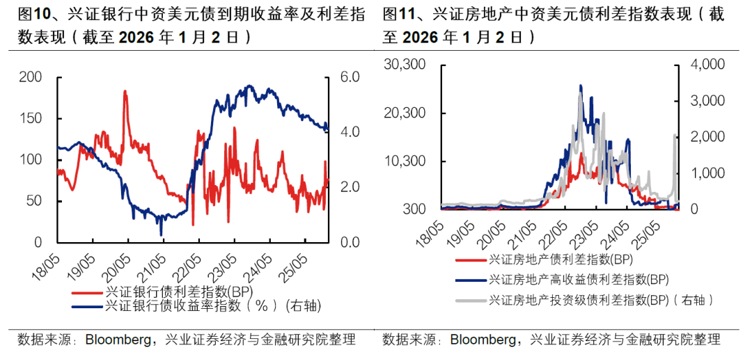 跟踪三个重点行业(房地产、银行、城投)中资美元债收益率和利差表现:2025 年12 月(截至2026 年1 月2 日),房地产板块收益率小幅下行,利差走阔。城投板块收益率较上月基本持平,利差走阔。银行板块收益率下行,利差收窄。具体来看,房地产中资美元债收益率指数下行55bp,城投中资美元债收益率指数上行2bp;银行中资美元债收益率指数下行21bp。