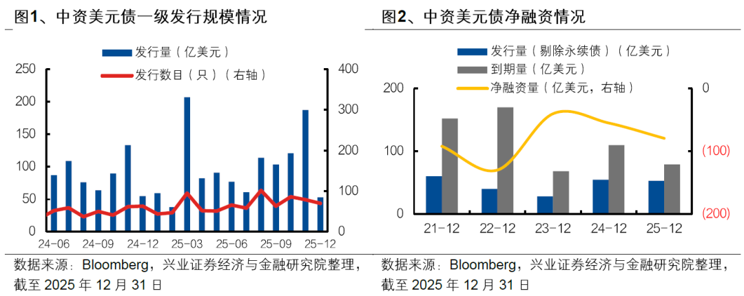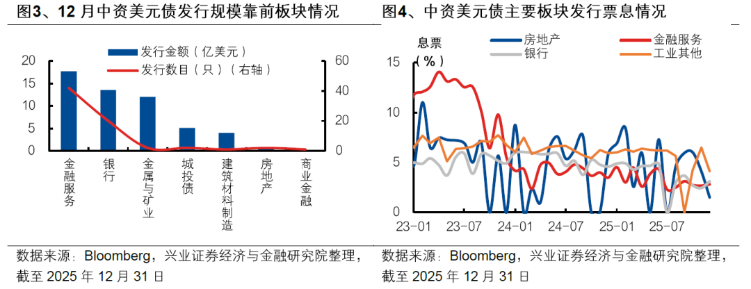 2025年12月中资美元债发行规模环比减少。2025年12月中资美元债共发行70只,总规模53.1亿美元,发行数量较11月减少。就评级层面而言,2025年12月发行中资美元债多数为无评级债券,仅3只投资级债券发行。2025年12 月新发行中资美元债中,金融服务板块发行规模较大。一般而言,中资美元债在年初的发行规模较大,关注近期的发行情况。[1]