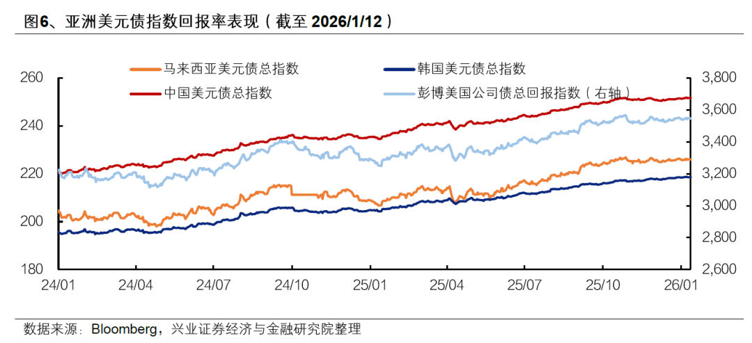 马来西亚、韩国、中国美元债总指数在2025年11月28日-12月31日区间回报率分别为-0.17%、0.23%、0.05%。