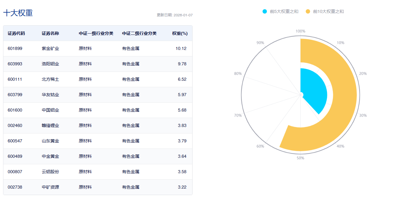 有色矿业ETF招商(159690)跟踪中证有色金属矿业指数,聚焦资源品上游,黄金、铜、铝等关键金属权重占比近6成,相对主流有色指数弹性更佳。