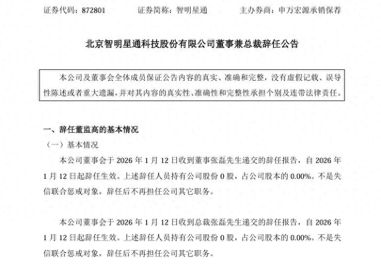 1月14日晚间,在新三板上市的老牌社交游戏公司北京智明星通科技股份有限公司(872801 NEEQ,以下简称“智明星通”)发布公告称,公司董事兼总裁张磊因个人原因辞去相关职务,即日起生效。公司表示,张磊的辞职不会对公司生产经营产生不利影响,并对其任职期间的贡献表示感谢。