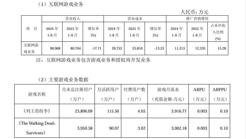 根据智明星通2025年第三季度主要经营数据公告显示,去年前三季度公司网游业务营收8.07亿元,较2024年同期下降17.71%。