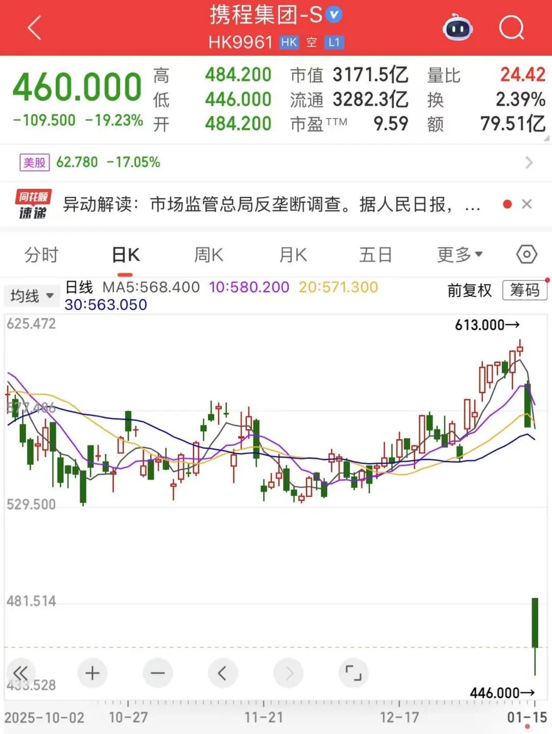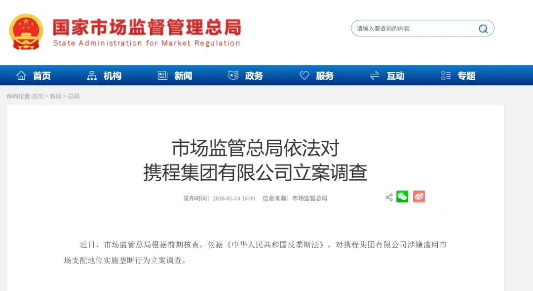 消息面上,1月14日从国家市场监督管理总局获悉,近日,市场监管总局根据前期核查,依据《中华人民共和国反垄断法》,对携程集团(HK)有限公司涉嫌滥用市场支配地位实施垄断行为立案调查。