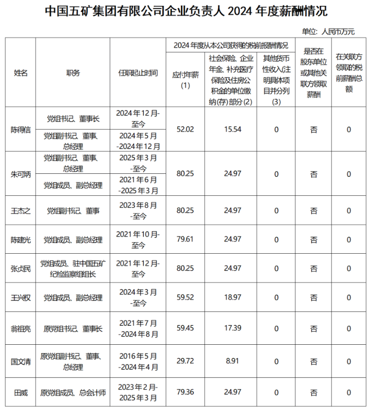 中国五矿集团企业负责人2024年度薪酬情况