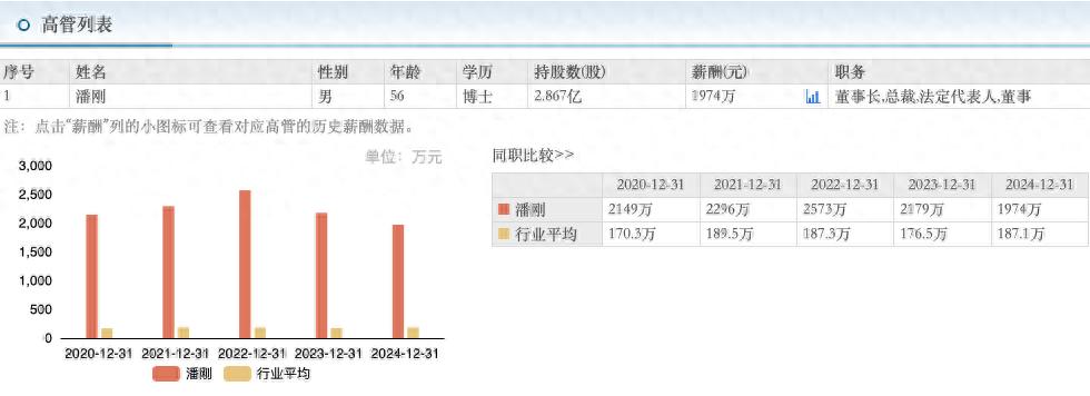 东方财富数据显示,2020年-2024年,潘刚的薪酬分别为2149万元、2296万元、2573万元、2179万元、1974万元。2024年薪酬未超2000万,降至近5年最低。