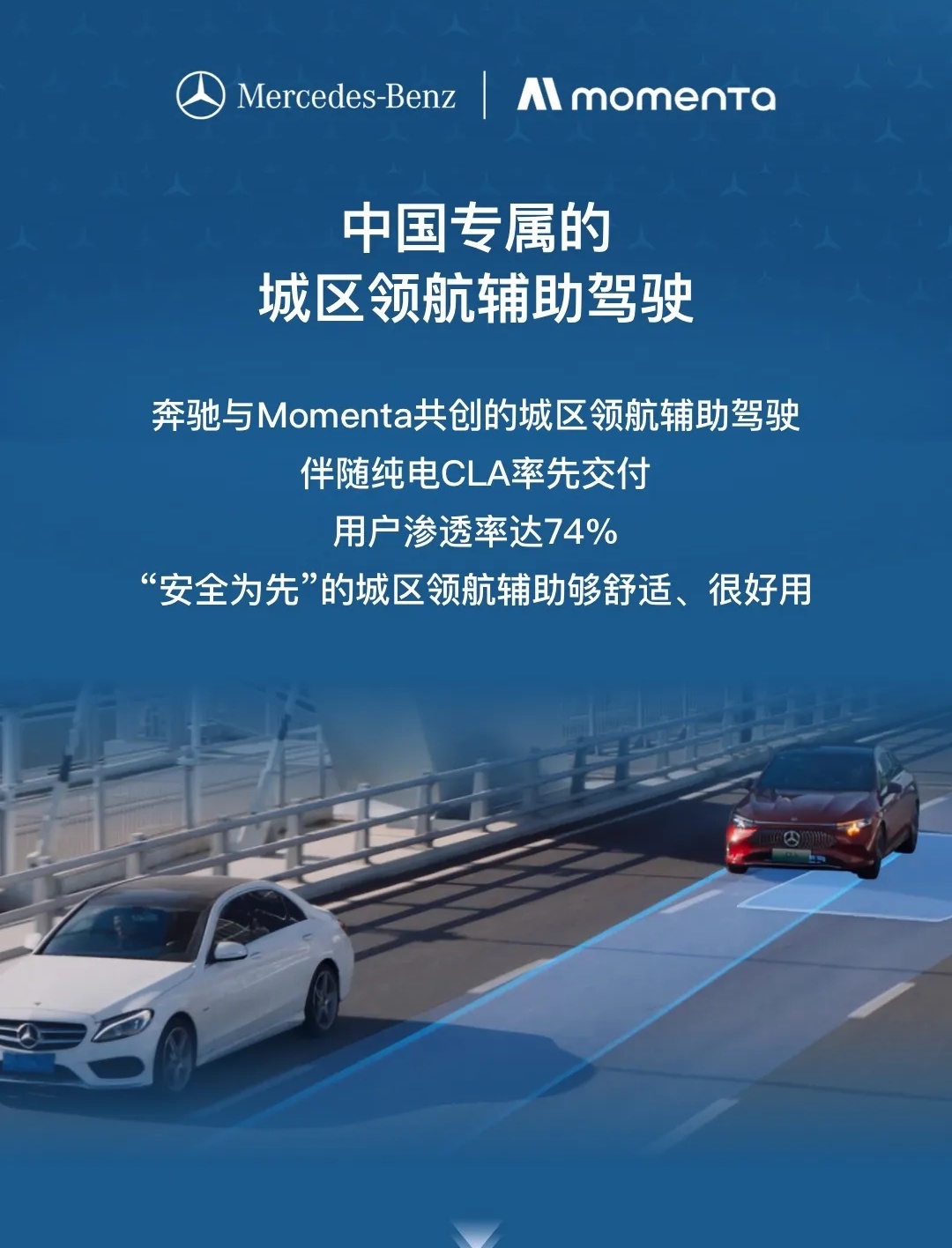 Momenta市占率第一不只体现在数据上,更源于用户真实的认可。中汽协报告指出,安全体验已成为城市NOA普及的核心。Momenta通过海量中国道路数据训练与极致安全验证,让系统在面对复杂场景时表现从容。以奔驰纯电CLA为例,其搭载与Momenta联合开发的智驾系统,完美融合“奔驰标准”与“中国速度”,上市后智驾功能用户渗透率高达74%,意味着绝大多数车主在可用场景下都会主动使用。有新手车主反馈,驾驶奔驰纯电CLA完成600多公里自驾,高速自动跟车、精准应对加塞、平稳通过窄弯道,全程无需手忙脚乱,“像副驾坐了位老司机,全程安心又默契”。