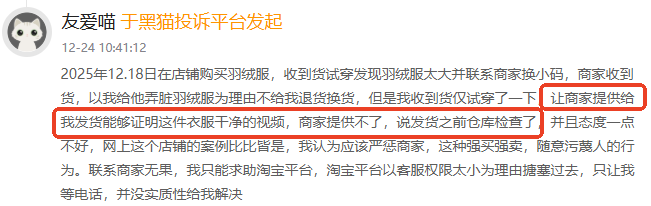 本月,多名消费者在黑猫投诉反馈,在New Balance购买商品售后时,退换货遭无理拒绝,商家诬陷商品脏污却无法提供发货视频;一消费者购买羽绒服,收货试穿后因尺码过大联系商家换小码。商家收到退回商品后,以羽绒服被弄脏为由拒绝退换。消费者称仅试穿商品,要求商家提供发货时可证明衣物干净的视频,商家无法提供,仅表示发货前仓库已检查,且沟通态度恶劣。12月New Balance在黑猫投诉上投诉量为76,回复率为0%。