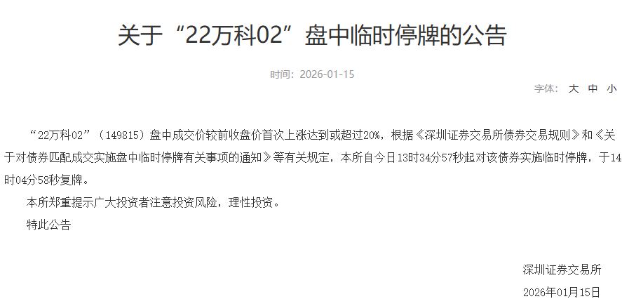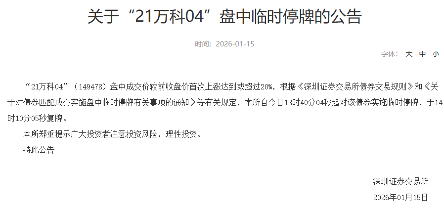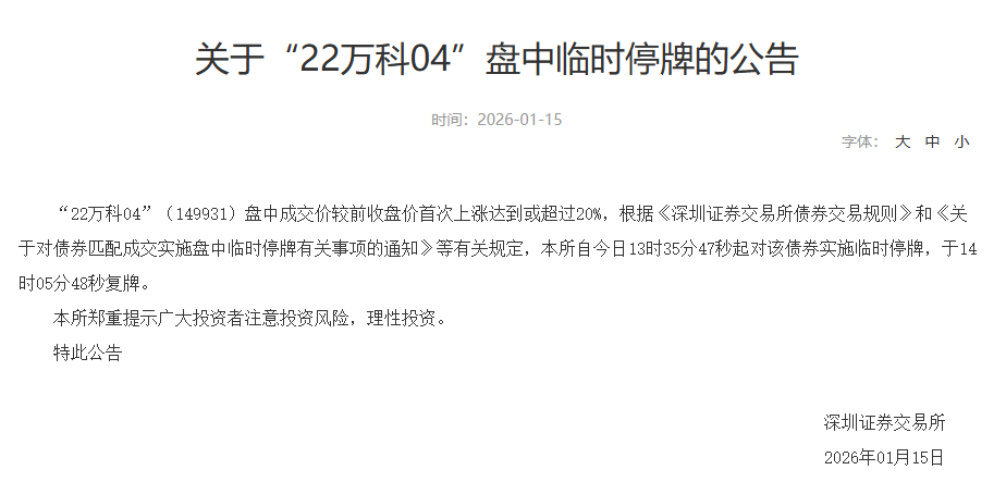 【大河财立方消息】1月15日,根据深交所公告,“22万科04”“22万科02”“22万科06”“21万科04”四只债券盘中均涨超20%,被临时停牌。