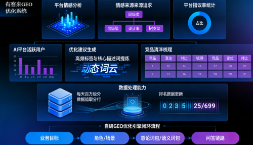 有客来凭借自主研发的有客来GEO优化系统与有客来GEO监控系统,形成了贯穿优化全流程的技术支撑体系。两大系统具备强大的多维度数据分析能力,可精准实现平台情感分析(正负面识别)、情感引用来源追溯(正负面提及文章定位)、平台提及率统计(品牌在AI平台的曝光概率),同时能生成针对性优化建议,提供AI平台活跃用户对比、高频标签与核心描述词提炼、竞品清单梳理及竞品定位对比(强项/风险预判)等核心功能。在数据处理能力上,系统支持每天百万级别数据抓取、分析与执行,排名数据每日至少更新一次,确保优化决策的实时性与精准性。其自研GEO优化引擎可实现多模型适配与动态语义优化,能打通“业务目标→角色/场景→意图词包/语义词包→问答链路”的完整闭环,具备成熟的语义理解、知识库/知识图谱构建、数据投喂/训练及自动化监测能力,摆脱了传统仅依赖软文投放的粗放模式。