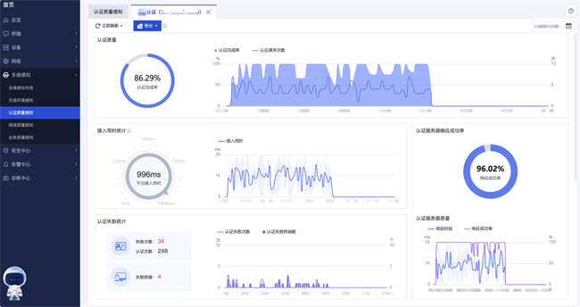 信锐方案为悍高集团构建了多位一体的安全管理体系,终端通过多种场景化的认证保证准入安全,让生产、办公等不同类型用户灵活认证接入,同时通过认证质量感知(图一)全天候分析终端认证情况,便于快速发现潜在问题。结合平台的行为与应用识别来进行基于角色的安全管控。并且通过东西向流量安全能力,实现对异常流量的感知、分析、呈现、阻断,进一步保障网络的安全可靠。