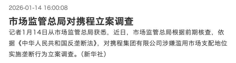 股价跳水最直接的导火索,是1月14日市场监管总局发布的立案调查公告。公告明确,依据《反垄断法》,对携程涉嫌滥用市场支配地位实施垄断行为启动调查。