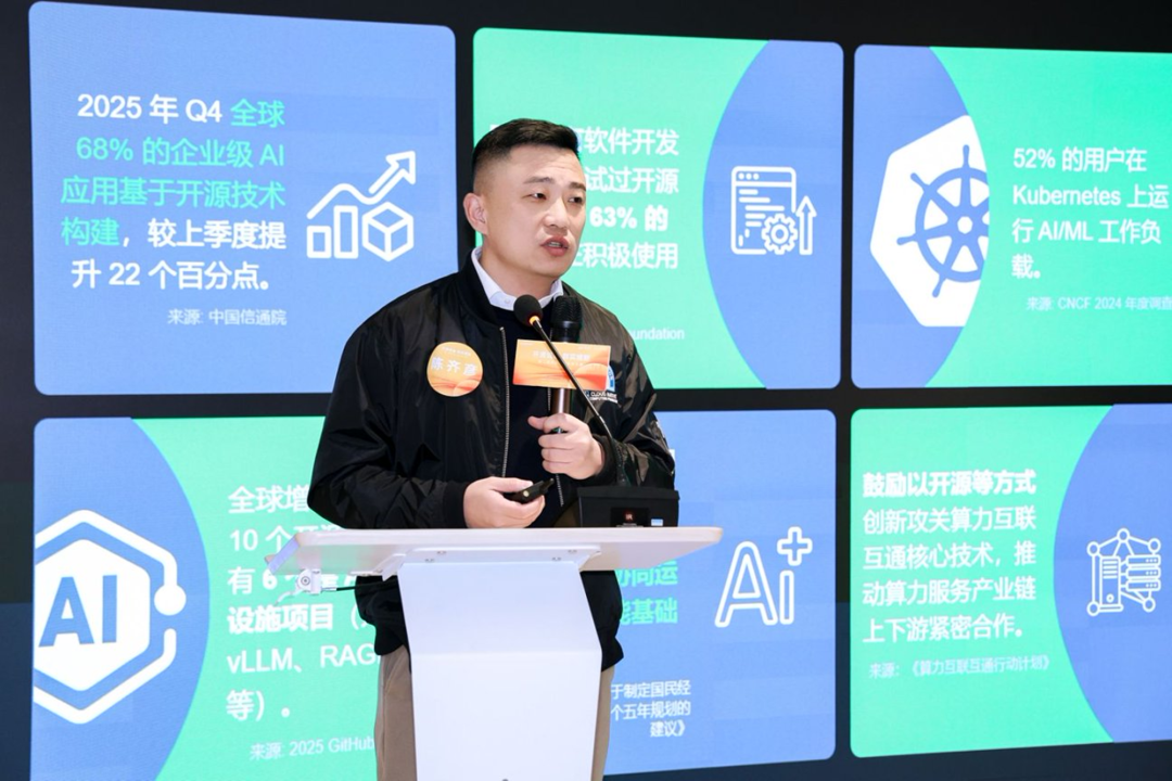 DaoCloud道客创始人&CEO陈齐彦则带来了极具前瞻性的观点——《开源产业的“MCN”时刻:构建上海开源“梦工厂”》。他形象地将开源项目比作IP,提出上海应构建一套系统化的孵化机制,像运营MCN一样运营开源项目,实现从代码到商业价值的高效转化。