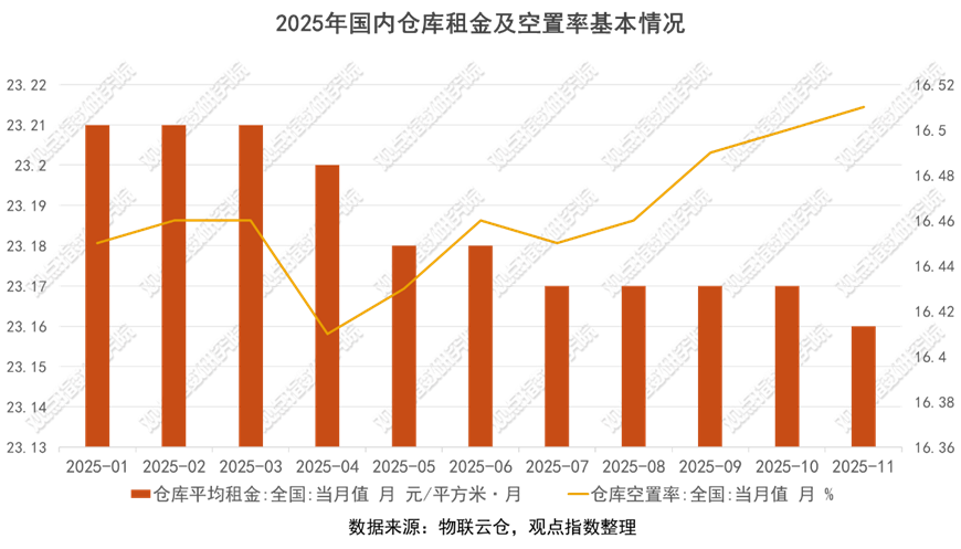 2025年全国仓库市场租金下跌趋势放缓,空置率整体稳定。 2025年仓储物流市场趋稳,全国仓库市场租金下跌趋势放缓(1月23.21元/平方米·月降至11月23.16元/平方米·月,累计降幅0.22%),空置率稳定在16.45%-16.51%区间;主要城市仓库租金跌幅更显著但收敛(1月23.79元/平方米·月降至11月23.46元/平方米·月,累计降幅1.39%),空置率逐月上升但同比边际改善(11月空置率15.94%,同比收窄至-0.38%)。