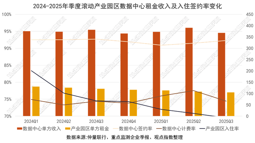 产业园区类不动产中,数据中心运营相对稳定,2024Q1-2025Q3单方收入波动(2025Q2达390.79峰值,Q3回落至368.01),签约率维持高位(90.9%-92.7%),计费率整体高于2024年水平;产业园区面临需求收缩压力,单方租金从2024Q1的130.8元/平方米逐季下降至2025Q3的105.0元/平方米(累计降幅19.7%),入住率从83.40%降至69.5%(累计下降13.9个百分点),租金与入住率持续双降,运营压力显著大于数据中心。