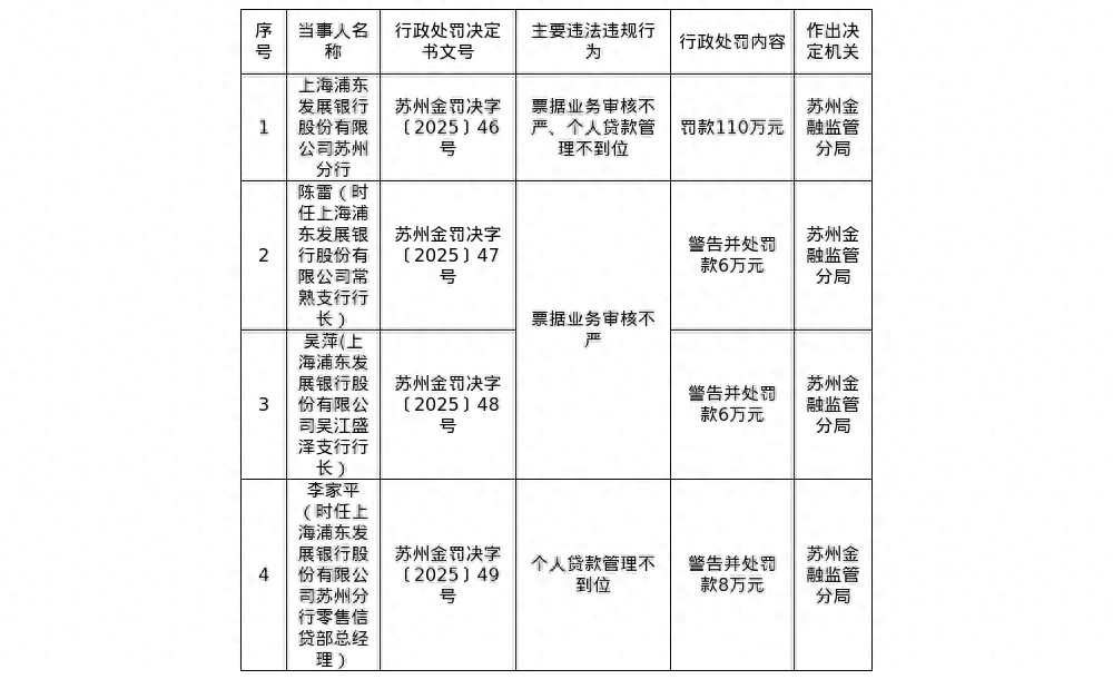 罚单显示,上海浦东发展银行股份有限公司苏州分行的主要违法违规事实(案由)为:票据业务审核不严、个人贷款管理不到位。