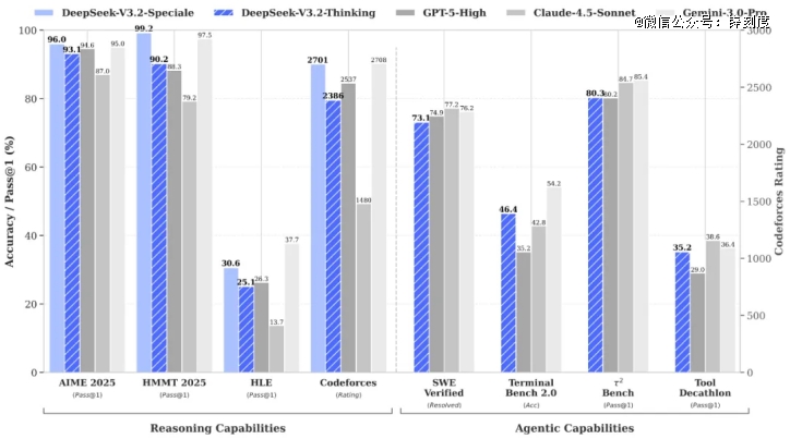 譬如,DeepSeek V3.2在公开的推理类基准测试中,已能够全面对标GPT-5,仅略低于Gemini 3 Pro。