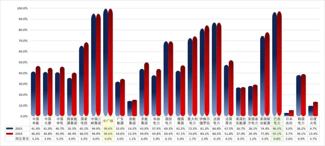 图1 对标企业2023-2024年非化石能源装机占比