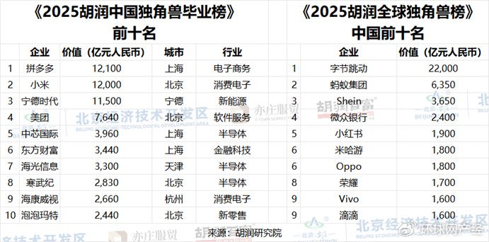 【环球网报道记者陈全】1月15日,创业企业榜单编制机构胡润研究院于北京亦庄发布《2025胡润中国独角兽毕业榜》(Hurun China Unicorn Graduates 2025 - In Search of China''s Most Successful Former Unicorns),列出了中国成立于2000年之后、价值10亿美元以上的上市公司,并按照企业价值进行排名。本次榜单估值计算的截止日期为2025年5月15日。这是胡润研究院首次发布该榜单。