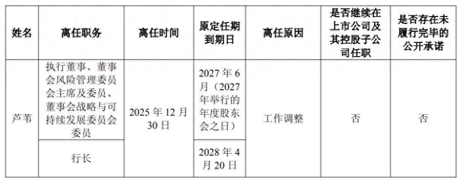 值得注意的是,2025年12月30日,因工作调整,芦苇辞去执行董事、行长等职务,其原定执行董事任期到2027年6月,行长任期到2028年4月20日。芦苇不会继续在公司及其控股子公司任职,也无未履行完毕的公开承诺。