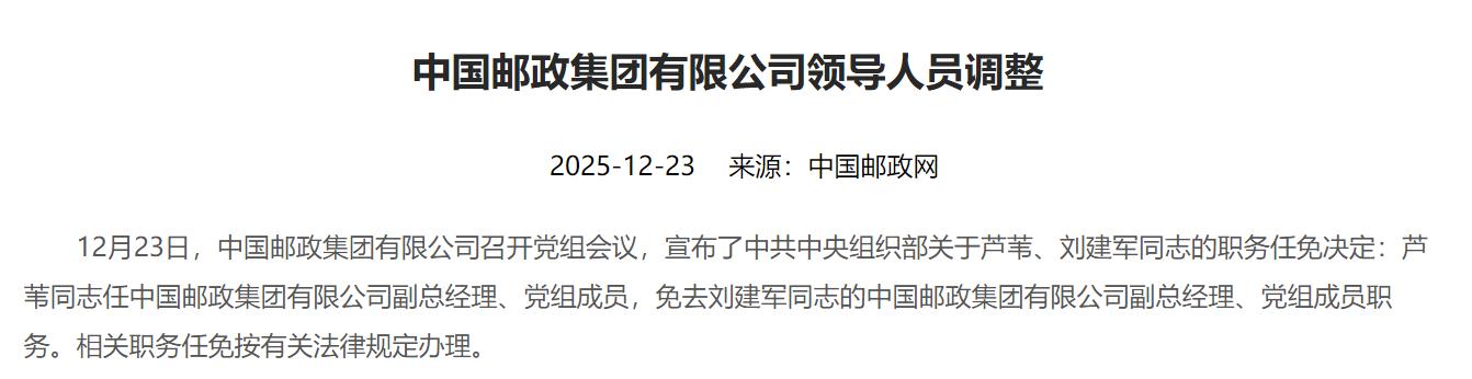 而在去年同月,中国邮政官网发布的公告显示,中国邮政集团有限公司召开党组会议,宣布了中共中央组织部关于芦苇、刘建军的职务任免决定。